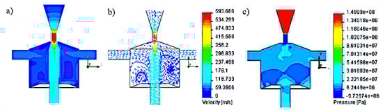 Distribution test results: (a,b) speed and (c) pressure inside the self-excited pulse head with side openings located at an angle of 120° (H = 20 mm, D = 20 mm, d2 = 3 mm, d3 = 5 mm, λ = 110°, h1 = 8 mm), for a nominal pressure of 150 MPa.