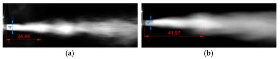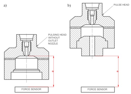 In the test stand for the self-excited pulse head working in the air medium, a piezoelectric force sensor and an ultrafast camera (Phanton V12.1, Vision Research, Wayne, NJ, US; which enables the recording of images at a speed of 1,000,000 frames per second, with a resolution of 1280 × 800 pixels and a sensitivity of 6400 ISO/ASA) were used to measure the frequency of the water jet pulses. Tests in the air environment were carried out for specific distances between the head and the piezoelectric force sensor (frequency range: 0–10 kHz; linearity %FSO (full scale output) ≤ ±1.5; hysteresis %FSO ≤ 1.5). Figure 8 shows the graphical interpretation of the distance measurement for pulsed and continuous jets.