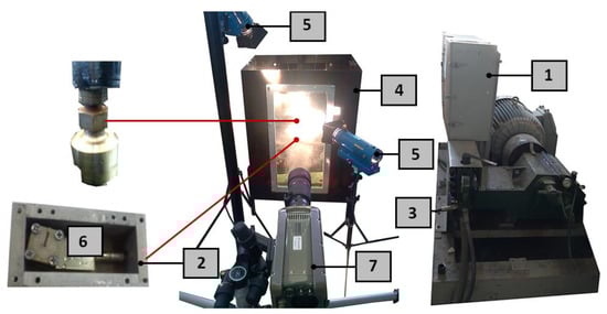 Measuring stations for recording images of impulse and continuous water jets operating in the air medium: 1−high-pressure power cord, 2−self-excited pulse head, 3−head mounting bracket, 4−force sensor, 5−lighting, 6−Phantom V12.1 camera.