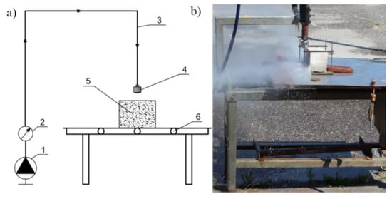 Stand for testing water jet erosivity: (a) stand diagram: 1−monitor unit, 2−manometer, 3−power cord, 4−self-excited pulse head, 5−workpiece, 6−sliding table, and (b) general view of the stand.
