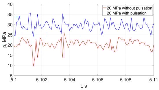 Representative examples of instantaneous pressure distributions and thrust forces of pulsating and continuous water jets, recorded with a force sensor with a KISTLER 9602AQ01 piezoelectric transducer during 10 ms, at different nominal pressures (20, 25 MPa) are presented in Figure 22.