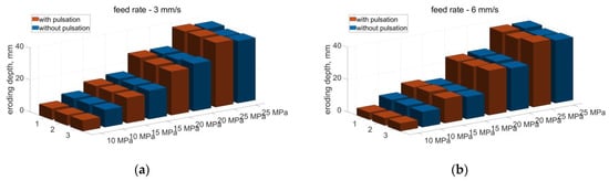 Comparison of the eroding depth of aerated concrete with a water jet (pulsating and without pulsation) produced in the drilling head with a feed rate of: (a) 3 mm/s, (b) 6 mm/s.