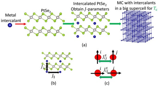 Figure 1. (a) The magnetic ions are intercalated in PtSe 2 . (b) The exchange parameters in the in-plane ( J ) and in the out-of-plane ( J ) direction. (c) The J parameters between spins i and j oriented in the in-plane direction ( J i j x ) and in the out-of-plane direction ( J i j z ).