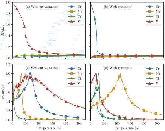 Figure 3. (a) The magnetization of intercalated PtSe 2 for various intercalants without any vacancies. M is the magnetization per intercalant atom obtained from the MC simulations and M sat is the saturation magnetization. (b) The magnetization of intercalated PtSe 2 for various intercalants in the presence of vacancies. (c) The specific heat c of intercalated PtSe 2 for various intercalants without any vacancies. (d) The specific heat c of intercalated PtSe 2 in the case where vacancies are present.
