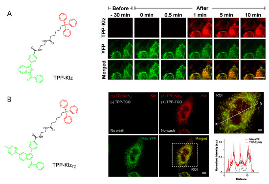 Conjugation with aggregation-induced emission luminogens (AIEgen) with TPP allowed a highly efficient fluorogenic mitochondria-targeting probe (Figure 2A) [29]. Kaleidolizine (KIz) as a molecular platform for AIEgen phenomena was reported to increase fluorescent intensity by over 120-fold when it aggregated [29]. As a versatile tool for monitoring biological systems, TPP-KIz was designed for bioimaging mitochondria and successfully visualized mitochondria in live cells within a minute without any additional washing step [29]. The further application of bioorthogonal chemistry for AIEgen allowed spatiotemporally controlled-mitochondria visualization with minimal perturbation of the cellular environment. Using the advantage of fast kinetics and selectivity of the reaction, the study of inverse electron-demand Diels–Alder (iEDDA) reactions between trans-cyclooctene (TCO) and tetrazine (Tz) combined with AIEgen-based KIz fluorophores and mitochondrial targeting TPP groups was reported (Figure 2B) [30]. Without TPP-TCO, TPP-KIzTz was quenched in a basal state, but iEDDA reactions with TPP-TCO dramatically increased the fluorescence of the product [30]. Bioorthogonal reactions between TPP-KIzTz and TPP-TCO suggested extremely specific and hypersensitive washing-free mitochondrial imaging by two-step mitochondrial targeting and the fluorescent turn-on process [30].