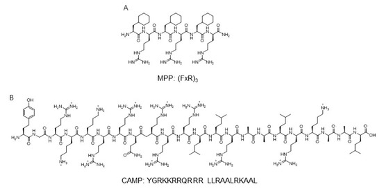 The sequence of mitochondria-targeting peptide MPP and CAMP [46,47]. Structures from references [46,47]. (A) The sequnce of MPP; (B) The sequnce of CAMP.