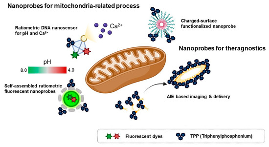 To investigate multiple physiological events in mitochondria, a ratiometric DNA nanosensor for simultaneous monitoring of both calcium and pH in mitochondria was developed [60]. A tetrahedron DNA-based nanoprobe was conjugated with four components including NIR emissive carbon dots bearing a calcium ligand (CD@Cal), pH-responsive fluorescein, TPP as a mitochondria-targeting motif, and an AF660 as a reference fluorophore for quantitative analysis [60]. Without any interference, a tetrahedron DNA nanoprobe measured calcium and pH simultaneously in vitro and quantified mitochondrial calcium concentration and pH in the neuron by real-time imaging [60]. However, self-assembled ratiometric fluorescent nanoprobes (SRFNPs) for monitoring mitochondrial pH were reported [61]. The preparation of the probe is based on a self-assembly mechanism by host-guest interaction between β-cyclodextrin polymer (β-CDP) as the host backbone and adamantine as the guest molecules [61]. Three different components, including fluorescein, rhodamine, and TPP, were introduced to the host backbone via conjugating with adamantane. Since fluorescein has pH-sensitive fluorescent intensity, the intensity ratio between fluorescein and rhodamine quantitatively reported the pH of the mitochondria in a ratiometric way. In this study, adamantane-conjugated TPP was used as a mitochondria targeting moiety [61]. SRFNP was successfully applied to monitor mitochondrial pH in the range pH 4.0–8.0 and low toxicity of SRFNP revealed the biocompatibility of the probes for live cells [61].