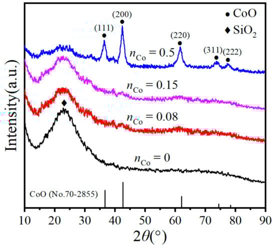 The XRD patterns of the unsupported Co/MSiO2 materials with various nCo calcined at 400 °C under N2 atmosphere are provided in Figure 2. A distinct diffraction peak at about 2θ = 23° is assigned to the feature of amorphous SiO2 for all samples, and the peak intensity decreases with increasing nCo. It is probably because the introduction of cobalt atoms replaces the original silicon atoms and forms the Si–O–Co bonds, resulting ultimately in an increase in Si–O–Co bonds and a decrease in SiO2. When nCo is equal to 0.5, significant absorption peaks appeared at 2θ = 36.57, 42.49, 61.64, 73.86, and 77.74°, which corresponds to the plane reflections of (111), (200), (220), (311), and (222) of CoO crystalline phase (PDF No. 70-2855), respectively, which indicates part of the cobalt is dispersed on the surface of the material in the shape of CoO. There are no peaks of CoO and Co3O4 in unsupported Co/MSiO2 material with nCo = 0. However, the characteristic peak of CoO in the samples with nCo = 0.08 and 0.15 is not obviously observed, which may be due to the fact that the CoO amount is too low or the size of the formed CoO is too small to be detected [36,37]. According to the literature, the XRD patterns of Co-doped silica powders with a cobalt mole fraction of 33% sintered at 550 °C with an existing Co3O4 peak [38]. In this paper, when nCo is equal to 0.08–0.5, no characteristic peak of Co3O4 is observed in the samples calcined at 400 °C, which does not mean that Co3O4 is not present in the sample. This may be owing to the fact that the content of Co3O4 is small and cannot be detected by XRD [36].