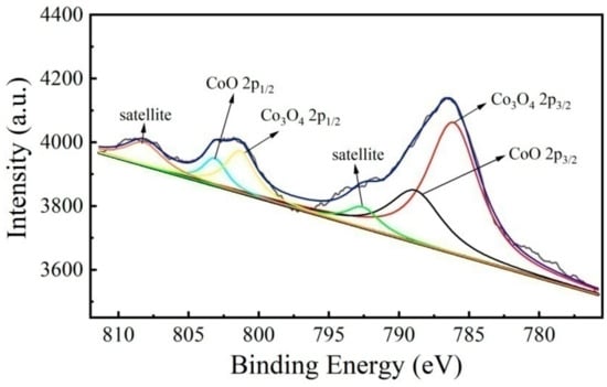 In order to further determine the presence of Co species in the unsupported Co/MSiO2 materials with nCo = 0.08, 0.15, and 0.5 calcined at 400 °C under N2 atmosphere. We characterized the unsupported Co/MSiO2 material with nCo = 0.08 by XPS. The XPS spectra curves for samples are displayed in Figure 3. The peaks at 786.2 eV and 801.3 eV are assigned to the 2p3/2 and 2p1/2 peaks of Co3O4, respectively, and the peaks of 789.1 eV and 803.3 eV correspond to the 2p3/2 and 2p1/2 peaks of CoO, respectively [40]. Additionally, two shake-up satellite peaks can be seen at 792.8 eV and 808.3 eV, which are because of the multi-electron excitation of Co2+ [28]. However, the binding energies of Co3O4 and CoO in the SiO2 material are higher than that of the pure component, as previously reported [41]. This is resulted from the formation of the Si–O–Co bond between Co oxides and Si atoms due to the interaction of electrons. Hence, the XPS investigation clearly indicated that the doped Co component is present in the oxide rather than the metal. This result was confirmed by XRD analysis. For the samples with even higher Co content, such as unsupported Co/MSiO2 materials with nCo = 0.15 and 0. 5, the Co signal becomes very strong (especially the latter one), and it is obvious that the peaks of Co3O4 and CoO are found in the samples by spectrum analysis. Therefore, the results are not included for comparison.