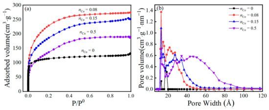 The physical characteristics of the prepared samples can be greatly influenced by their specific surface area and porous structure. The N2 adsorption-desorption isotherm curves of unsupported Co/MSiO2 materials with various nCo at 400 °C are displayed in Figure 5a. As shown in Figure 5a, the isotherms for the four samples all show a similar trend, which can be categorized as type I isotherm. In the range of low relative pressure P/P0 < 0.1, a substantial amount of adsorption indicates that there is a giant quantity of micropores in the materials. As the relative pressure increases, the isotherm gradually increases, which confirms the existence of a small amount of mesopores. The N2 adsorption of unsupported Co/MSiO2 materials increases initially with the increasing nCo, then begins to decrease as nCo > 0.08, which indicates the change of pore-volume variation trend. The distributions of pore size for all samples are depicted in Figure 5b. It is found that the unsupported Co/MSiO2 materials with nCo = 0.08–0.5 have a wider pore size distribution and a bigger mean pore size than the sample with nCo = 0. In addition, the pore diameters of all samples are mainly concentrated around 1.3 nm. The detailed information about the pore size and surface area for these four samples is provided in Table 1. It can be observed that, with the increases of nCo, the mean pore size increases, and the micropore volume decreases; the total pore volume and BET surface area increase until nCo = 0.08, after which they begin to decrease. This is because the added cobalt atoms exist in the form of Si–O–Co bonds in the SiO2 skeleton, and the atomic radius of the cobalt atoms is larger than that of the silicon atoms, which plays a role in expanding the pores [45]. So, with the increase of nCo, the particle size, mean pore size, total pore volume, and surface area, the distribution of pore size becomes wider and shifts gradually to the direction of the mesopores. However, as nCo > 0.08, in addition to the existence of cobalt in the skeleton in the amorphous form, there are also some cobalt oxides interspersed in the pores to block part of the pores, which leads to a decreasing in the pore volume and BET surface area. When nCo = 0.08, the unsupported Co/MSiO2 material is more favorable for achieving a higher total pore volume (0.424 cm3·g−1) and BET surface area (775.344 m2·g−1), with the minimum mean pore diameter (2.34 nm). Therefore, the unsupported Co/MSiO2 material with nCo = 0.08 is more favorable for gas separation.