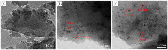 To gain an insight into the Co species, the TEM analysis was performed to determine the presence of Co species in unsupported Co/MSiO2 materials with various nCo calcined in N2 atmosphere at 400 °C. Figure 6 demonstrates the transmission electron microscope images for unsupported Co/MSiO2 materials with nCo = 0, 0.08, and 0.15 calcined in N2 atmosphere at 400 °C. For these three samples, because of differences in electronic density, the darker-contrast particles can be attributed to cobalt oxide, while the lighter-contrast particles are attributed to silica carrier. In Figure 6a, amorphous silica can be observed on Co/MSiO2 material with nCo = 0. In Figure 6b,c, a small amount of the CoO crystals are uniformly dispersed on the surface of Co/MSiO2 materials with nCo = 0.08 and 0.15, and the particle size of the CoO crystals increases with the increasing nCo. Furthermore, the crystal size of CoO in Co/MSiO2 material with nCo = 0.08 is in the range of 1.3–2.2 nm, and that in the Co/MSiO2 material with nCo = 0.15 is in the range of 1.9–2.7 nm. Nevertheless, no Co3O4 particles were found on the outside surfaces of two samples, which does not imply that Co3O4 does not exist in the samples. This may be due to the tiny amount. For the unsupported Co/MSiO2 material with nCo = 0.5, it is clear that particles of Co3O4 and CoO are scattered on the surface of the sample by TEM analysis because of a higher Co content. Thus, the sample is not introduced here. It can be seen that the conclusions obtained above are consistent with the results from the XRD and XPS analysis.