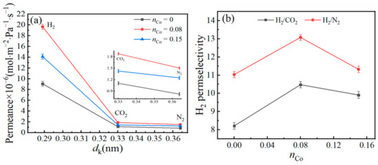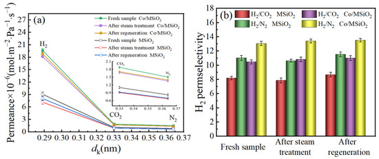 (a) Gases’ (H2, CO2, and N2) permeances versus gas molecules’ kinetic diameters (dk) and (b) H2 perm-selectivities of supported Co/MSiO2 membranes with various nCo at a pressure difference of 0.2 MPa and 200 °C.
