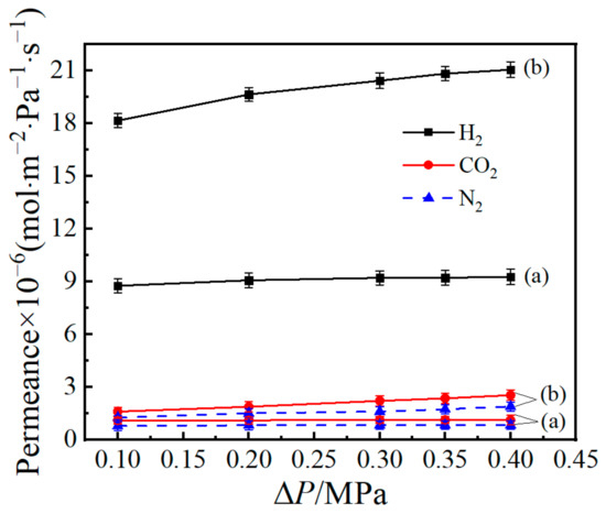 Influence of pressure difference on the gases’ (H2, CO2, and N2) permeances for supported (a) MSiO2 membrane and (b) supported Co/MSiO2 membrane with nCo = 0.08 at 200 °C.