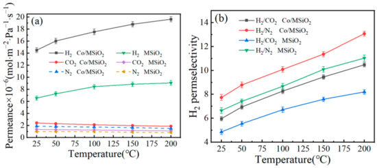 Influence of temperature on the (a) gases’ (H2, CO2, and N2) permeances and (b) H2 perm-selectivities for supported MSiO2 membrane and supported Co/MSiO2 membrane with nCo = 0.08 at 0.2 MPa.