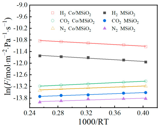 Arrhenius plots of gases’ (H2, CO2, and N2) permeances in supported MSiO2 membrane and supported Co/MSiO2 membrane with nCo = 0.08 at 0.2 MPa.