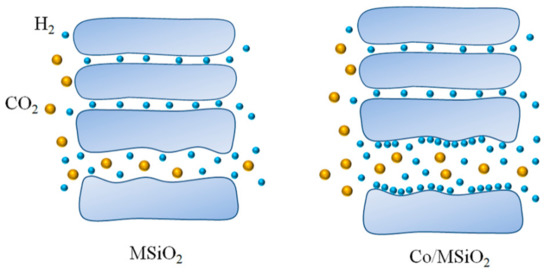 The transport of H2, CO2, and N2 in MSiO2 membrane is controlled by molecular sieving, but Knudsen diffusion still exists due to the presence of small mesopores. However, thanks to the absorption for molecules of H2 by cobalt, the introduction of cobalt particles improves the surface diffusion of molecules of H2 in SiO2 membranes, which promotes the transmission of H2 and leads to the growth for permeance of H2 in the Co/MSiO2 membrane. Hence, we can find that, compared with CO2 and N2, the Co/MSiO2 membrane has the higher permeation rate to H2. Consequently, compared with MSiO2 membrane, the permeance of H2 and the perm-selectivities of H2/CO2 and H2/N2 in Co/MSiO2 membrane increase simultaneously. The possible change mechanism of MSiO2 and Co/MSiO2 membranes for separating H2/CO2 is schematically illustrated in Figure 11.