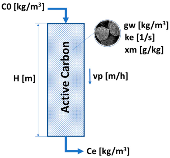 Certain simplifying assumptions are adopted during the modeling of the adsorption process on granular activated carbon: the flowing medium is incompressible, the volume flow is constant over time, the bed is homogeneous, and it has the same porosity value in each cross-section. Moreover, the value of the mass transfer coefficient during the process is constant. Therefore, the adsorption capacity throughout the entire grain cross-section is the same. Transport of the adsorbate mass along the bed is carried out due to hydraulic flow diffusion [9,12,18,21,22,23,24,25].