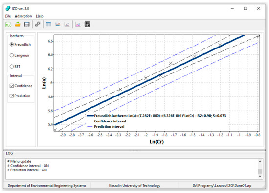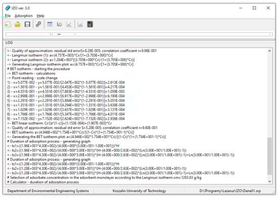 Currently, there is a lack of specialized computer programs that, in an accessible way, cover in detail the issues of calculating the duration of the adsorption process on a granular activated carbon bed, using the value of the adsorbate concentration in the adsorbent layer obtained from adsorption isotherms. Therefore, to solve that problem, the IZO computer application was developed. Moreover, the computational linearization method of adsorption isotherms implemented into the program was checked for accuracy by nonlinear estimation under laboratory conditions [22,26,27,28]. The laboratory tests of the adsorption process of leachate from a municipal landfill on selected active coals ORGANOSORB 10, DESOTEK, and BA-10, were conducted.
