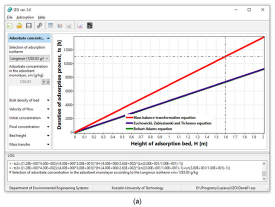 The IZO application uses Equations (1), (7) and (8) to generate the graph of the duration of the adsorption process tS vs. the height of the adsorption bed H (Figure 4a). There is also a possibility to change the values of other independent parameters in limited ranges, i.e., the concentration of adsorbate in the monolayer xm (1 ≤ xm ≤ 2000) [g/kg], bulk density of the adsorbent gw (300 ≤ gw ≤ 500) [kg/m3], initial concentration C0 (0 ≤ C0 ≤ 10,000) [kg/m3], assumed final concentration Ce (0 ≤ Ce ≤ 10,000) [kg/m3], flow velocity vp (1 ≤ vp ≤ 20) [m/h], and external mass transfer coefficient ke (0.01 ≤ke ≤ 0.5) [s−1]. Besides, the application can import the calculated value of the adsorbate concentration in layer xm from module 1. However, the maximum time of the adsorption process tS during chart generation (Figure 4a) is calculated using Equation (1). In most cases, Equations (7) and (8) give similar results. That is why the lines representing mentioned equations overlap in Figure 4a.