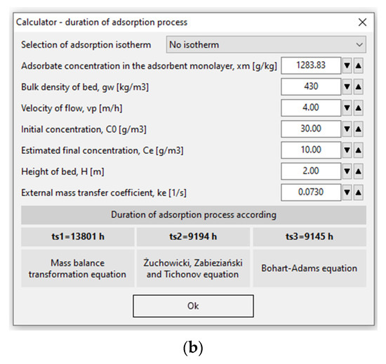 An additional element in module 2 is the so-called calculator, which quickly calculates the duration of the adsorption process tS, taking into account changes of the mentioned parameters (Figure 4b). The calculator gives three answers according to Equations (1), (2) and (8).