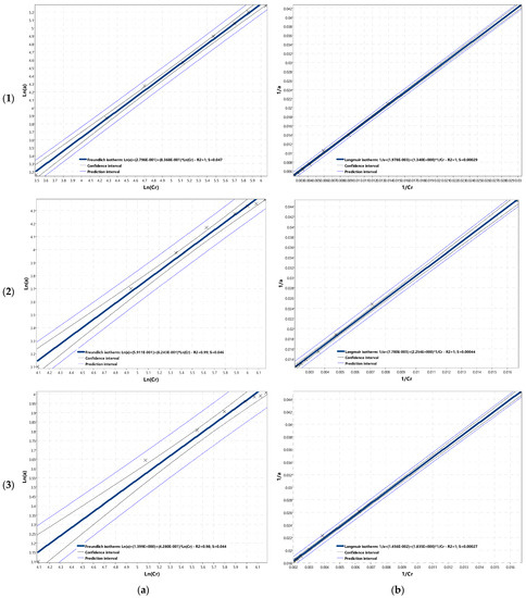 Simultaneously, the results of laboratory tests were introduced into the Statistica program, and the coefficients of adsorption isotherms were calculated using a nonlinear estimation method according to Gauss-Newton. The assumed convergence criterion was 1 × 10−6; the initial value for variables was 0.1. Table 2 presents a comparison of coefficients of adsorption isotherms calculated using a nonlinear estimation (Statistica) and linearization (IZO) along with a coefficient of determination R2 for each method.