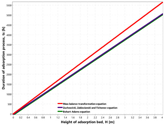 The lack of a parameter w in the Formula (8) does not significantly change the duration of the tS adsorption process. Like in Formula (7), the value of the first part of the Equations (2), (7) and (8), i.e., xm·gw·(vp·C0)−1 is much higher than the value of the rest of the equation concerning the difference in the height of the adsorbent bed and the adsorption front.