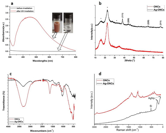 Comparison between for ONCs and Ag–ONCs: (a) UV–Vis before and after UV irradiation (b) X-ray diffraction (XRD), (c) Attenuated Total Reflectance Fourier Transform Infrared (ATR–FTIR), and (d) Raman spectra. Note that the * in (b) are referred to the XRD cellulose peaks in the nanocomposite.
