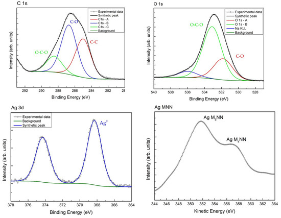 XPS spectra deconvolution for C 1s, O 1s, Ag 3d and Auger spectrum for Ag.