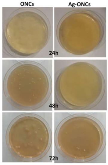 Agar diffusion method experiments are carried out to evaluate the effective antibacterial properties of the Ag–ONCs nanocomposites against E. coli after different incubation times (as illustrated in Figure 4).
