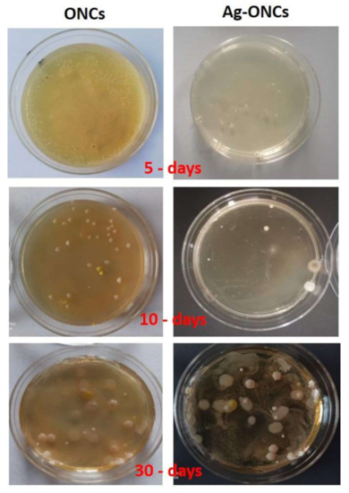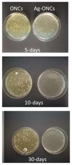 Figure 5 and Figure 6 show the E. coli growth in ONCs and Ag–ONCs for the samples left under natural light and stored in the dark, respectively.