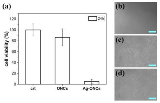 (a) Cell viability of NIH-3T3 cells after 24 h of exposure to Ag–ONCs or ONCs and without any NP treatment (crt). Data are presented as mean ± standard deviation (SD). Optical micrographs of NIH-3T3 cells treated with (b) Ag–ONCs or (c) ONCs and (d) without any NP treatment after 24 h of incubation (Scale bar = 100 µm).