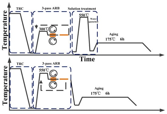 Before the TRC Al-Mg-Si sheets were processed with ARB, their contact surfaces were cleaned with a wire brush and degreased with acetone to ensure smoothness and flatness. Subsequently, the sheets were stacked and wired together to achieve good bonding between them.
