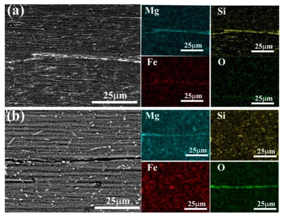 Figure 3 shows the surface SEM spectra of ARB sheet interfaces fabricated at different temperatures. It can be inferred from the figures that solute elements (Mg, Si, and Fe) exhibited obvious aggregation at the interfaces. Besides, a continuous and semi-continuous second phase containing Al, Mg, Si, and Fe was formed during the ARB processing at 300 °C. However, when processed with ARB at 550 °C, the interfaces only revealed the aggregation of Mg, indicating that the diffusion and aggregation of Mg occurred while Si and Fe were not significantly enriched near the interface. The alloy surface is susceptible to oxidation at high temperatures, and when the temperature rises above 394 °C, Mg atoms become significantly more mobile [12], making them much easier to combine with O atoms and form oxides.