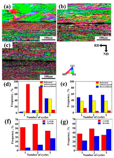 EBSD inverse pole figure (IPF) maps of the ARB sheets (a) after one cycle, (b) after two cycles, (c) after three cycles; (d) recrystallization map fraction of the thick sheet; (e) recrystallization fraction map of the thin sheet; (f) grain boundary maps of the thick sheet; (g) grain boundary maps of the thin sheet.