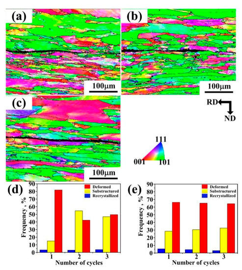 IPF maps of ARB sheets (a) after one cycle, (b) after two cycles, (c) after three cycles; (d) recrystallization fraction in the thick sheet; (e) recrystallization fraction in the thin sheet.