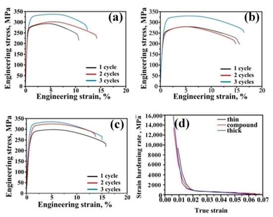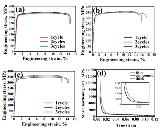 Engineering stress–strain curves of 550 °C ARB sheets after aging treatment: (a) Thin sheets, (b) compound sheets, (c) thick sheets, and (d) strain hardening rate of different sheets three-cycles ARB processing at 550 °C.