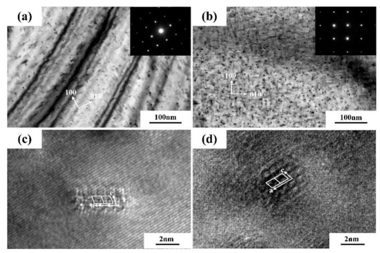 The TEM micrographs depicting the distribution of intragranular precipitates in the compound ARB sheets are shown in Figure 8. Judging from the high-resolution TEM (HRTEM) diagrams (Figure 8c,d), the precipitated phase was the β” phase. However, the precipitated phases showed varied sizes and number densities in different areas on both sides.