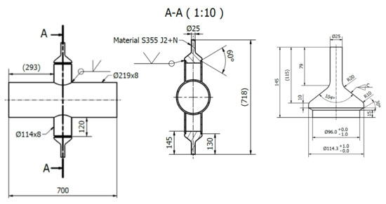 The DT joint consists of a 219.1 mm × 8.2 mm member with an adjoining 114.3 mm × 8.5 mm member. The geometry is considered to reflect a single-sided weld made from the outside. During the fabrication, the joint braces were cut so that the brace inner circumference matched the chord profile. The braces were then joined to the chord with single-sided welds.