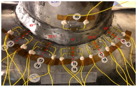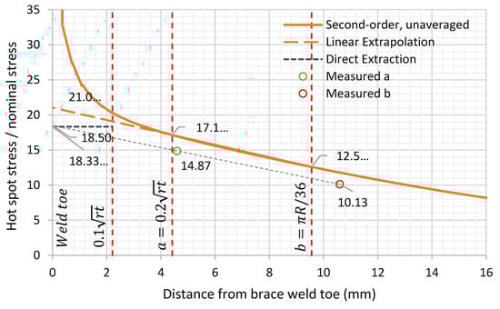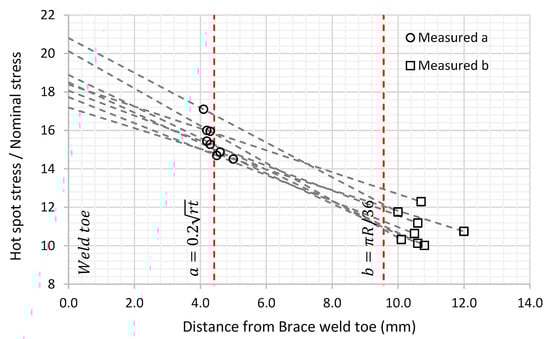 Figure 10 shows the distribution of strain gauges along the weld toe’s intended “a” and “b” locations and the extrapolation lines to the SCF value for each pair of points. After strain gauges installation, the average distance between “a” and “b” was approximately 6.3 mm.