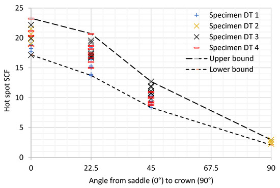 The mean experimental SCF at the saddle positions varied from 18.43 from specimen DT1 to 20.88 from specimen DT3, with an average SCF of 19.87 with a standard deviation of 1.72 and CoV of 8.7%. The variation can be seen to be relatively small and enables a statistical bias for design purposes. Although not directly related, these CoV values are within the range (5–10%) that probabilistic codes, such as DNVGL-RP-C210 [