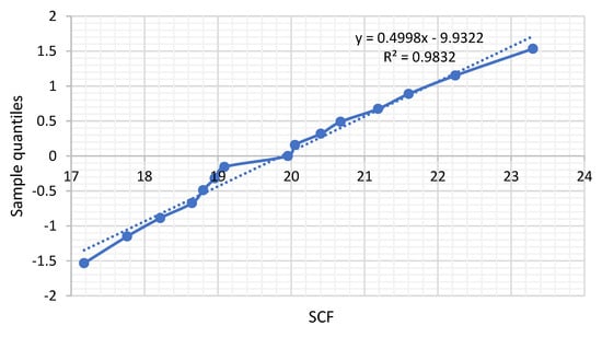 Figure 9. By bootstrapping the data, it is indicated that the 90% confidence interval for the mean value of the SCF was [19.3, 20.6] and for the standard deviation [1.2, 2.1], providing a CoV in the range of 5–10%.