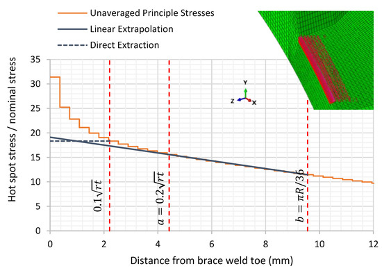In the linear extrapolation method, the principal stresses were extracted at each node on the path perpendicular to the weld toe and these were used to interpolate the stresses at point “a” and “b” (the points of interest). The extrapolation of the SCF at the saddle, from the stresses at these two points, is shown in