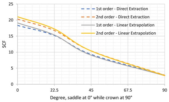 Reference points for extrapolation can be used as the averaged or unaveraged stress between element nodes. The finer the mesh, the closer the results from both averaged and unaveraged stresses. First-order elements with reduced integration (1 point) at the most refined mesh showed a difference in the linearly extrapolated SCFs of 1.0% between the averaged and unaveraged principal stresses and 1.6% for the direct extraction method. While for second-order elements with reduced integration (8 points), the average and unaveraged stresses for both direct extraction and linear extrapolation showed less than 1% variation.