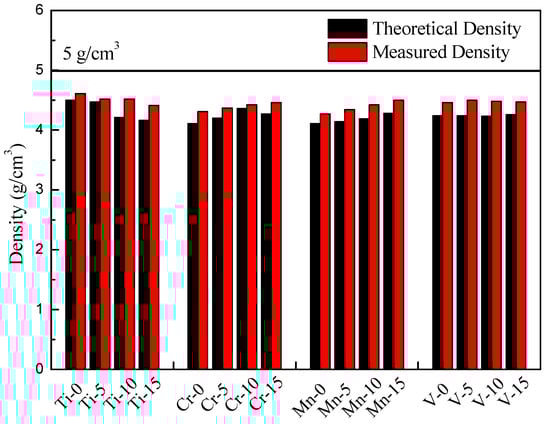 By maintaining the atomic ratio of Al at 50%, Al50–Ti–Cr–Mn–V MEAs can achieve low density (<5 g/cm3), with a density distribution from 4 to 5 g/cm3. By using Archimedes’ principle, all measured results were close to the theoretical results by mixing rules; the theoretical and measured densities are presented in Figure 1.