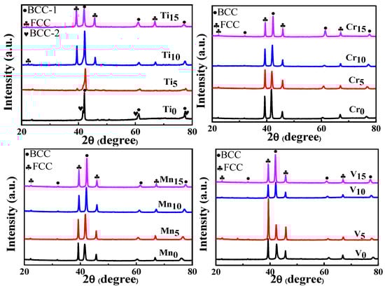 - Most of the MEAs exhibited a dual-phase (FCC + BCC) structure. Cr, Mn, and V with their small atomic radii were mainly distributed in the BCC phase, and Al and Ti with their large atomic radii were mainly distributed in the FCC phase. However, if the Ti element concentration was not sufficient in the alloy, the structure converted to dual BCC phases.