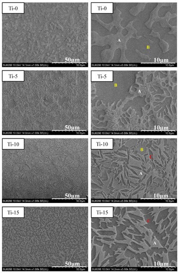SEM images of the Al50(CrMnV)50-xTix (x = 0, 5, 10, 15) alloys (A: BCC-1; B: BCC-2; C: FCC).