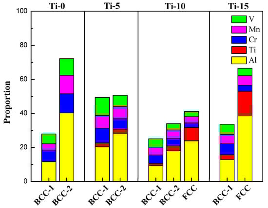 The proportion of Al, Ti, Cr, Mn and V in the dual-phase of Al50–Ti–Cr–Mn–V alloys.
