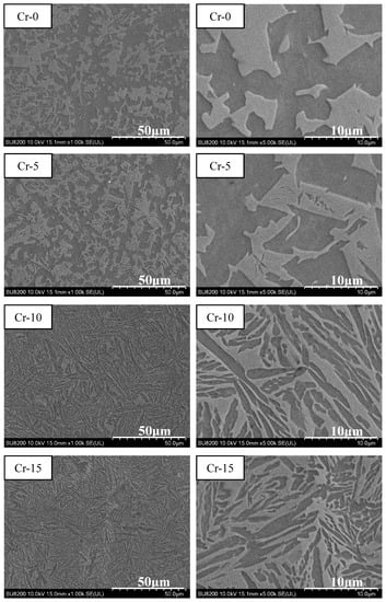 SEM images of the Al50(TiMnV)50-xCrx (x = 0, 5, 10, 15) alloys.