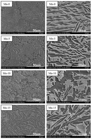 The SEM analysis is illustrated in Figure 11. In Al50Ti20Cr10Mn17.5V2.5, the morphology presented as a finer dual-phase structure, differing from the morphology of Al50Ti20Cr10Mn15V5 and Al50Ti20Cr10Mn12.5V7.5, which presented in the shape of a bamboo leaf. When the V content was increased to 15%, the phase became thicker and the morphology of Al50Ti20Cr10Mn10V10 changed into an island shape.