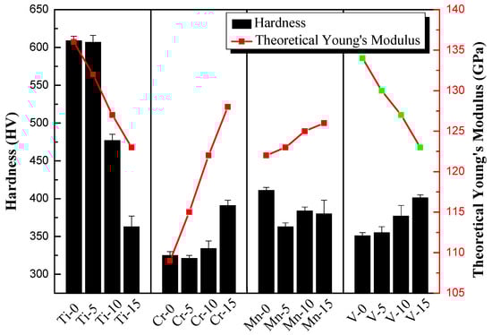 The relationship between hardness and theoretical Young’s modulus of Al50–Ti–Cr–Mn–V alloys.